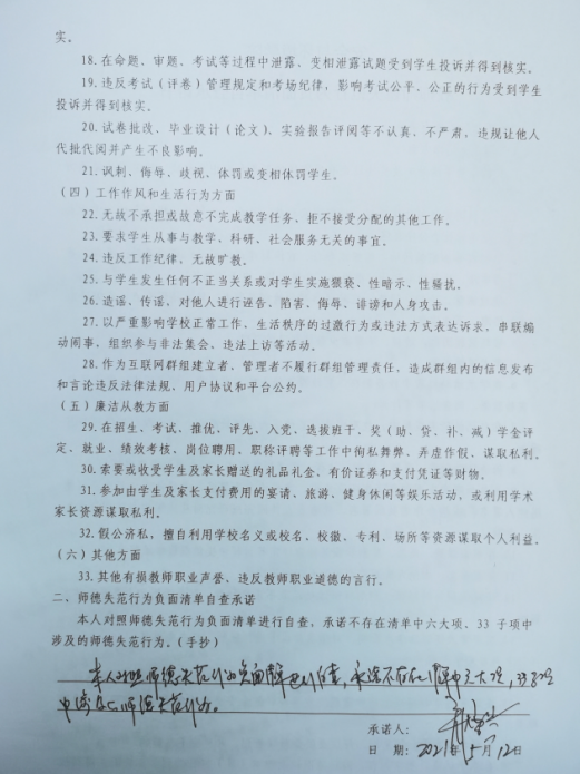 2、開展師風(fēng)師德自查。逐個教師、逐個教研室進(jìn)行徹底排查,落實每個教職工在思想政治紀(jì)律、學(xué)術(shù)道德、教育教學(xué)、工作作風(fēng)、生活行為、廉潔從教及其他等諸方面是否存在師德失范行為。全體教職工公開表態(tài)承諾,并簽訂《安全與環(huán)境學(xué)院教師師德失范行為負(fù)面清單自查承諾書》和《學(xué)術(shù)不端行為自查情況表》。