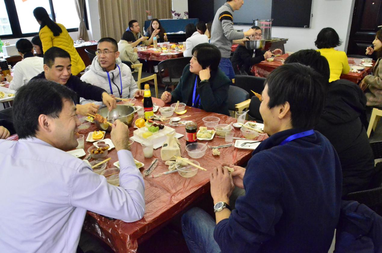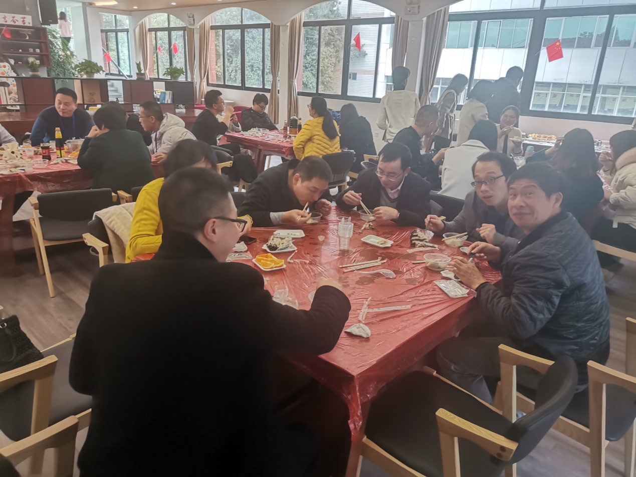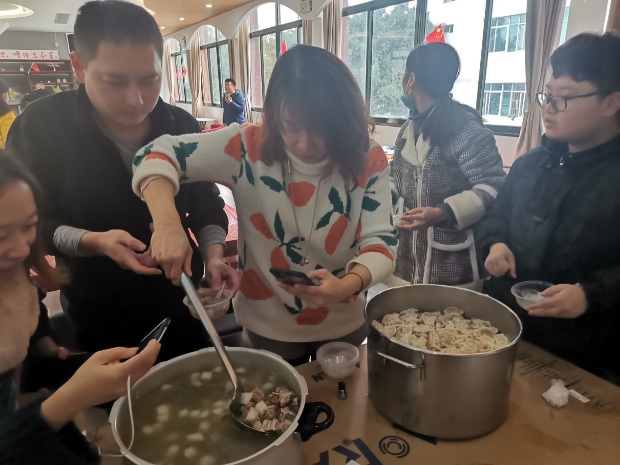 伴隨著一陣幸福的忙碌,一盤盤熱氣騰騰、香味四溢的餃子出鍋嘍,歡聚一堂的教職工們吃的津津有味,其樂融融,幸福之情無以言表!