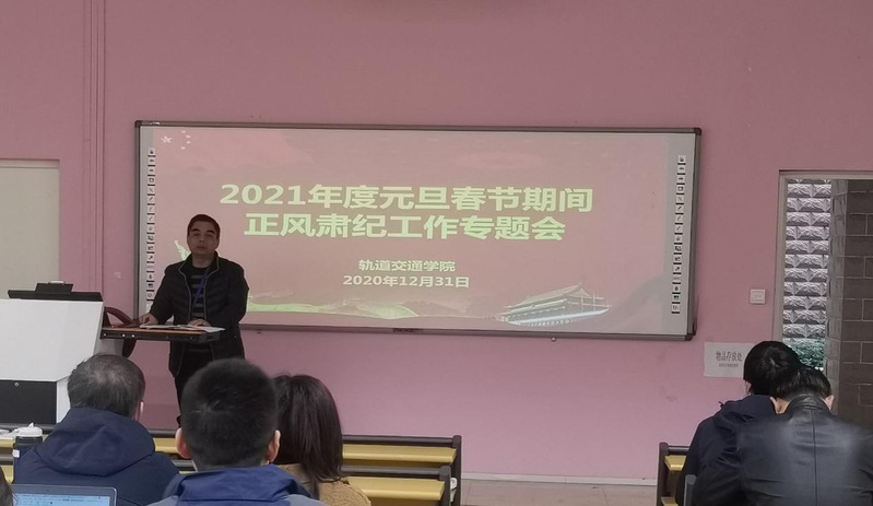 根據(jù)省委辦公廳、省政府辦公廳《關(guān)于做好2021年元旦春節(jié)期間有關(guān)工作的通知》和省紀(jì)委監(jiān)委有關(guān)工作要求以及學(xué)院紀(jì)委《關(guān)于做好2021年元旦春節(jié)期間正風(fēng)肅紀(jì)工作的通知》的相關(guān)規(guī)定,為統(tǒng)籌做好新冠肺炎疫情防控和節(jié)日期間正風(fēng)肅紀(jì)工作,確保元旦春節(jié)期間風(fēng)清氣正,2020年12月31日,軌道交通學(xué)院在北區(qū)二號(hào)樓1-3多媒體教室召開2021年度元旦春節(jié)期間正風(fēng)肅紀(jì)工作專題會(huì)。軌道交通學(xué)院黨政領(lǐng)導(dǎo)班子、全院教職工參加會(huì)議,會(huì)議由孫基書記主持。
