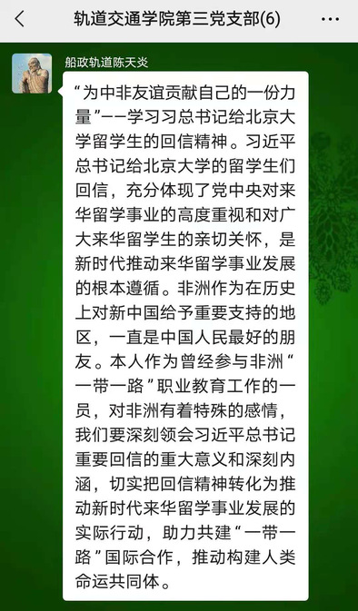 軌道交通學(xué)院院長陳天炎:“為中非友誼貢獻(xiàn)自己的一份力量”——學(xué)習(xí)習(xí)近平總書記給北京大學(xué)留學(xué)生的回信精神。習(xí)近平總書記給北京大學(xué)的留學(xué)生們回信,充分體現(xiàn)了黨中央對來華留學(xué)事業(yè)的高度重視和對廣大來華留學(xué)生的親切關(guān)懷,是新時(shí)代推動來華留學(xué)事業(yè)發(fā)展的根本遵循。非洲作為在歷史上對新中國給予重要支持的地區(qū),一直是中國人民最好的朋友。本人作為曾經(jīng)參與非洲“一帶一路”職業(yè)教育工作的一員,對非洲有著特殊的感情,我們要深刻領(lǐng)會習(xí)近平總書記重要回信的重大意義和深刻內(nèi)涵,切實(shí)把回信精神轉(zhuǎn)化為推動新時(shí)代來華留學(xué)事業(yè)發(fā)展的實(shí)際行動,助力共建“一帶一路”國際合作,推動構(gòu)建人類命運(yùn)共同體。