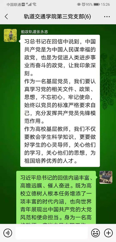 軌道交通學(xué)院青年教師陳宏意:習(xí)近平總書記的回信內(nèi)涵豐富、高瞻遠(yuǎn)矚、催人奮進(jìn)。既為高校立德樹人根本任務(wù)增添了一項(xiàng)豐富的時(shí)代內(nèi)涵,也向世界青年展現(xiàn)出中國共產(chǎn)黨的大黨風(fēng)范和使命擔(dān)當(dāng)。身為一名高校教師,應(yīng)當(dāng)立足本職工作,以立德育人為己任,引導(dǎo)青年學(xué)子聽黨話,感恩黨,跟黨走,不忘初心、牢記使命,勇?lián)負(fù)?dān),為下一個(gè)百年目標(biāo)貢獻(xiàn)更多力量。