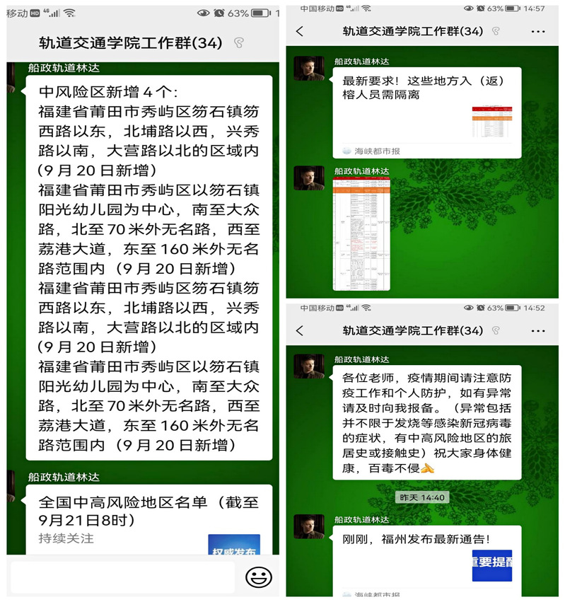 軌道交通學(xué)院第三黨支部黨員先鋒突擊隊充分利用學(xué)院QQ群、微信群等信息化手段,發(fā)布疫情防控簡訊和通知,及時調(diào)度提醒,加強對政策措施的宣傳解讀,確保疫情信息上下暢通、左右共享,構(gòu)建以預(yù)防為主、防治結(jié)合的防控工作長效管理與應(yīng)急處理機制,引導(dǎo)學(xué)院師生正確判斷疫情形勢,確保有效應(yīng)對各種突發(fā)情況,增強戰(zhàn)勝疫情的信心。