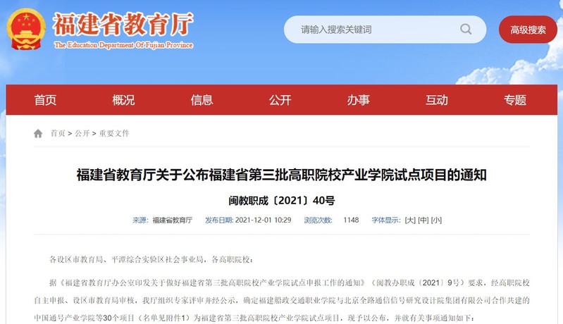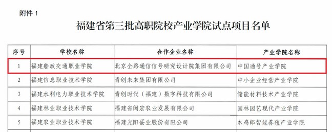 根據(jù)《福建省教育廳關于公布福建省第三批高職院校產業(yè)學院試點項目的通知》(閩教職成〔2021〕40號),福建船政交通職業(yè)學院軌道交通學院與北京全路通信信號研究設計院集團有限公司合作建立的中國通號產業(yè)學院成功入選福建省第三批高職院校產業(yè)學院試點項目,這是福建船政交通職業(yè)學院軌道交通學院堅持立德樹人根本宗旨、落實產教融合創(chuàng)新發(fā)展的重要成果體現(xiàn)。
