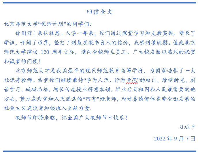在第38個教師節(jié)前夕,在黨的二十大即將召開的重要時刻,中共中央總書記、國家主席、中央軍委主席習(xí)近平給北京師范大學(xué)“優(yōu)師計(jì)劃”師范生回信,對他們寄予殷切期望,并向全國廣大教師致以節(jié)日的祝福。