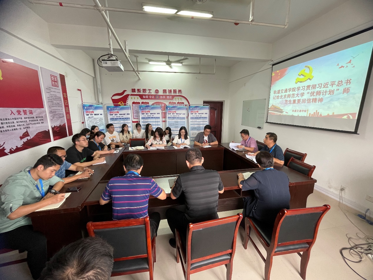 為認(rèn)真學(xué)習(xí)貫徹習(xí)近平總書記的重要回信內(nèi)容,全面落實(shí)立德樹人根本任務(wù),持續(xù)加強(qiáng)師德師風(fēng)建設(shè),以實(shí)際行動迎接黨的二十大勝利召開。2022年9月23日上午,軌道交通學(xué)院在第一會議室組織學(xué)習(xí)了習(xí)近平總書記給北京師范大學(xué)“優(yōu)師計(jì)劃”師范生重要回信精神,并一同觀看了《習(xí)近平的教師情》專題片。學(xué)院黨政領(lǐng)導(dǎo)班子、全院教職工參加會議,會議由孫基書記主持。