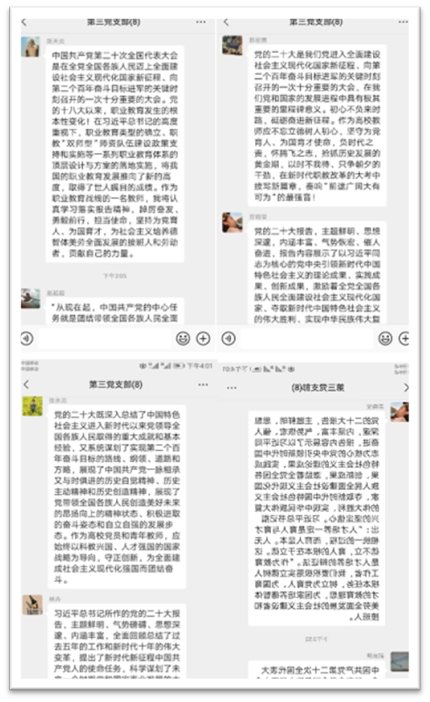 支部副書記陳宏意:黨的二十大在我們黨和國(guó)家的發(fā)展進(jìn)程中具有極其重要的里程碑意義。初心不負(fù)來時(shí)路,砥礪奮進(jìn)新征程。作為高校教師應(yīng)不忘立德樹人初心,堅(jiān)守為黨育人、為國(guó)育才使命,負(fù)時(shí)代之責(zé),懷騰飛之志,搶抓歷史發(fā)展的黃金期,以時(shí)不我待、只爭(zhēng)朝夕的干勁,在新時(shí)代職教改革的大考中續(xù)寫新篇章,奏響“前途廣闊大有可為”的最強(qiáng)音!