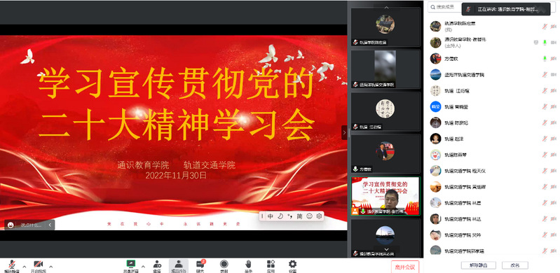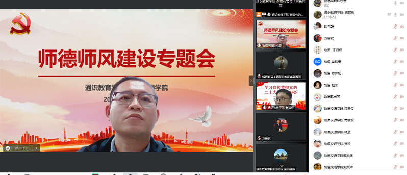 2022年11月30日,軌道交通學(xué)院聯(lián)合通識(shí)教育學(xué)院以線(xiàn)上線(xiàn)下相結(jié)合的方式共同召開(kāi)學(xué)習(xí)宣傳貫徹黨的二十大精神的動(dòng)員部署會(huì)暨師德師風(fēng)建設(shè)專(zhuān)題研討會(huì)。兩個(gè)學(xué)院全體教職員工參加會(huì)議,會(huì)議由方儒欽院長(zhǎng)主持。