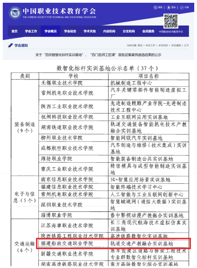 近日,中國職業(yè)技術(shù)教育學會發(fā)布《關(guān)于“百所數(shù)智化標桿實訓基地”、“百門名師工匠課”首批征集案例遴選結(jié)果的公示》,我校軌道交通學院“軌道交通產(chǎn)教融合實訓基地”成功入選全國首批“百所數(shù)智化標桿實訓基地”。