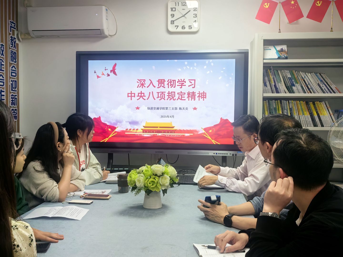 為深入推進黨風廉政建設,強化黨員干部紀律意識和作風建設,軌道交通學院第三黨支部在校友樓2樓會議室集中學習了《中共中央八項規(guī)定及實施細則》在濃厚的學習氛圍中深刻領悟中央八項規(guī)定精神的內涵與重要意義。