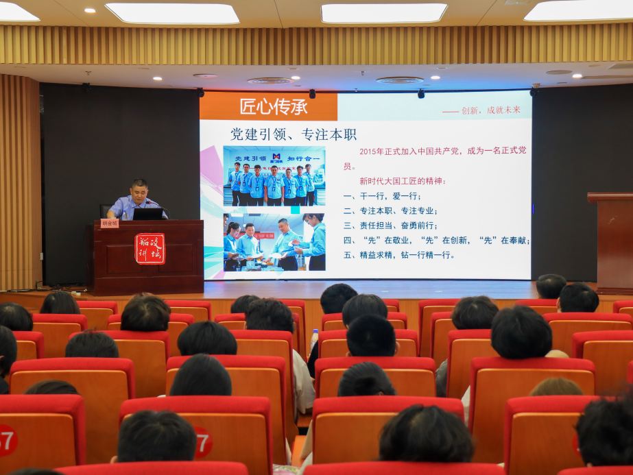 講座中,胡金城以質(zhì)樸的語言回顧了自己從安溪陳利職校電子電器專業(yè)學生成長為行業(yè)技術(shù)領(lǐng)軍人物的奮斗歷程。30年前,他懷揣著對技術(shù)的熱愛,從家電維修工起步,歷經(jīng)電子公司創(chuàng)業(yè)者、船舶重工電氣專家、地鐵高級技師等多重身份轉(zhuǎn)變。作為廈門地鐵高級技術(shù)人員,胡金城結(jié)合廈門地鐵智能照明系統(tǒng)改造、通風空調(diào)節(jié)能技改等案例,生動詮釋了“創(chuàng)新始于堅守”的工匠精神。他帶領(lǐng)團隊研發(fā)的“一鍵開關(guān)站”項目榮獲全國發(fā)明展覽會金獎,智能照明系統(tǒng)改造累計節(jié)約成本超60萬元,并獲得國家實用新型專利。他的故事生動詮釋了“干一行愛一行,鉆一行精一行”的工匠精神內(nèi)涵。同時,他也分享了自己作為黨員和工匠的雙重身份,如何在工作中發(fā)揮先鋒模范作用,傳承和弘揚工匠精神,培養(yǎng)出一批又一批優(yōu)秀的技術(shù)人才。