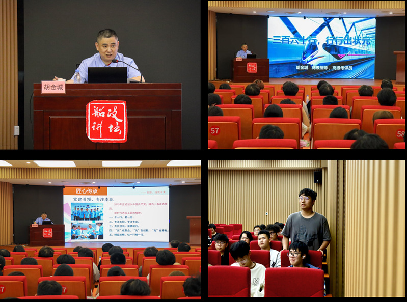參觀結(jié)束后,胡金城大師為軌道交通學(xué)院的全體師生作了題為《三百六十行,行行出狀元》的勞模工匠講座。胡金城大師結(jié)合自身多年一線工作經(jīng)驗,分享了軌道交通行業(yè)的技術(shù)發(fā)展趨勢、崗位技能要求及職業(yè)成長路徑。他勉勵師生夯實專業(yè)基礎(chǔ)、錘煉實操能力,以適應(yīng)行業(yè)智能化、數(shù)字化發(fā)展的新需求。在互動環(huán)節(jié),胡金金城大師耐心解答了師生關(guān)于技能提升、創(chuàng)新實踐和職業(yè)規(guī)劃等問題,現(xiàn)場氣氛熱烈,得到了現(xiàn)場師生的一致好評。
