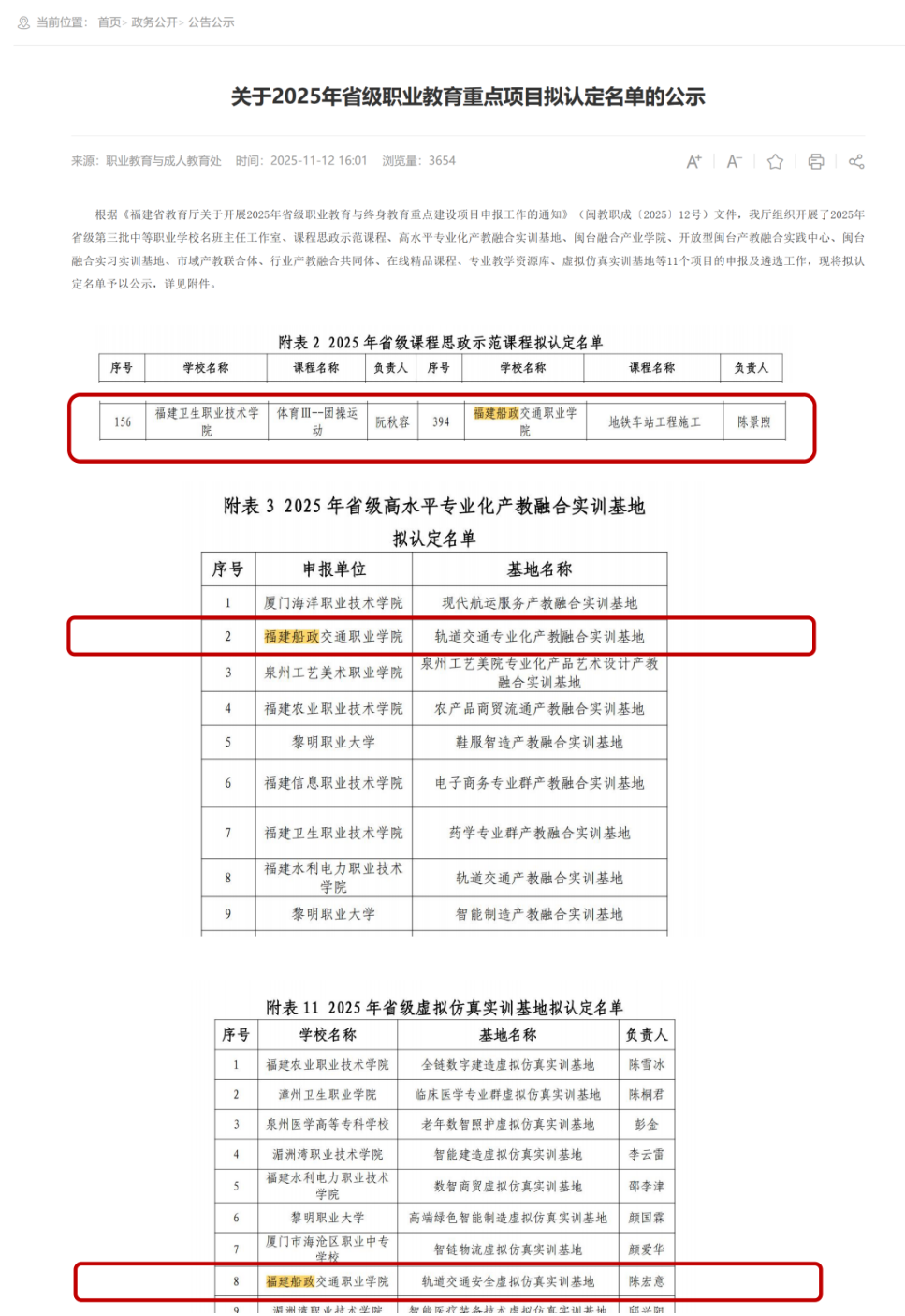 近日,福建省教育廳公布2025年省級(jí)職業(yè)教育重點(diǎn)項(xiàng)目擬認(rèn)定名單,軌道交通學(xué)院共有3個(gè)重點(diǎn)項(xiàng)目入圍。其中,陳天炎院長(zhǎng)牽頭負(fù)責(zé)的《軌道交通專(zhuān)業(yè)化產(chǎn)教融合實(shí)訓(xùn)基地》被認(rèn)定為2025年省級(jí)高水平專(zhuān)業(yè)化產(chǎn)教融合實(shí)訓(xùn)基地;陳宏意副院長(zhǎng)牽頭負(fù)責(zé)的《軌道交通安全虛擬仿真實(shí)訓(xùn)基地》被認(rèn)定為2025年省級(jí)虛擬仿真實(shí)訓(xùn)基地;陳景煦博士負(fù)責(zé)的《地鐵車(chē)站工程施工》被認(rèn)定為2025年省級(jí)課程思政示范課程。