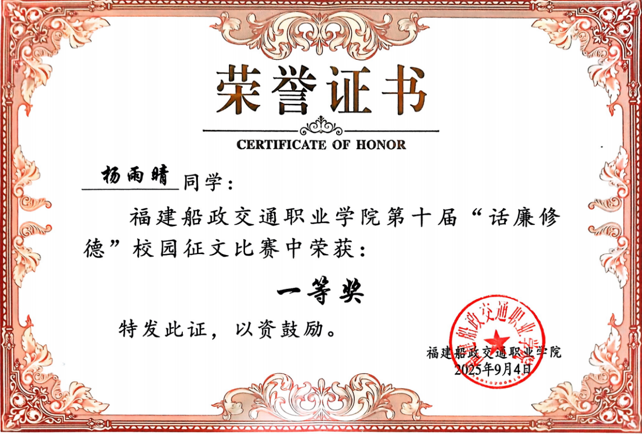 楊雨晴同學(xué)的作品緊扣主題,將廉潔精神與軌道交通行業(yè)特色、校園實(shí)踐相結(jié)合,文筆真摯、立意深刻,展現(xiàn)了我院學(xué)子崇廉尚潔的良好風(fēng)貌,最終脫穎而出。