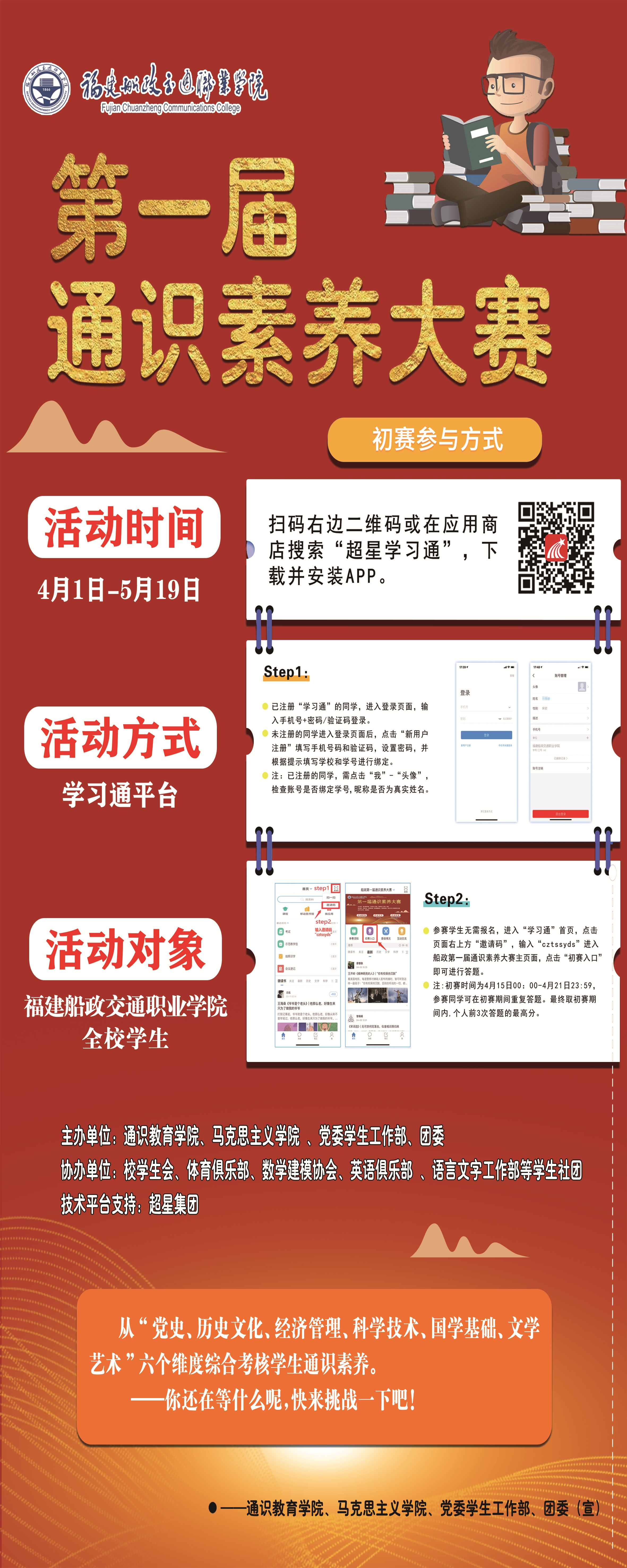 為豐富學(xué)院黨史學(xué)習(xí)教育和“再學(xué)習(xí)、再調(diào)研、再落實(shí)”活動(dòng)形式,打造喜迎建黨100周年特色慶祝活動(dòng),提高大學(xué)生通識(shí)素養(yǎng),促進(jìn)學(xué)生德智體美勞全面發(fā)展,打造校園文化活動(dòng)品牌,通識(shí)教育學(xué)院、馬克思主義學(xué)院、黨委學(xué)生工作部、團(tuán)委決定聯(lián)合舉辦“福建船政交通職業(yè)學(xué)院第一屆通識(shí)素養(yǎng)大賽”。