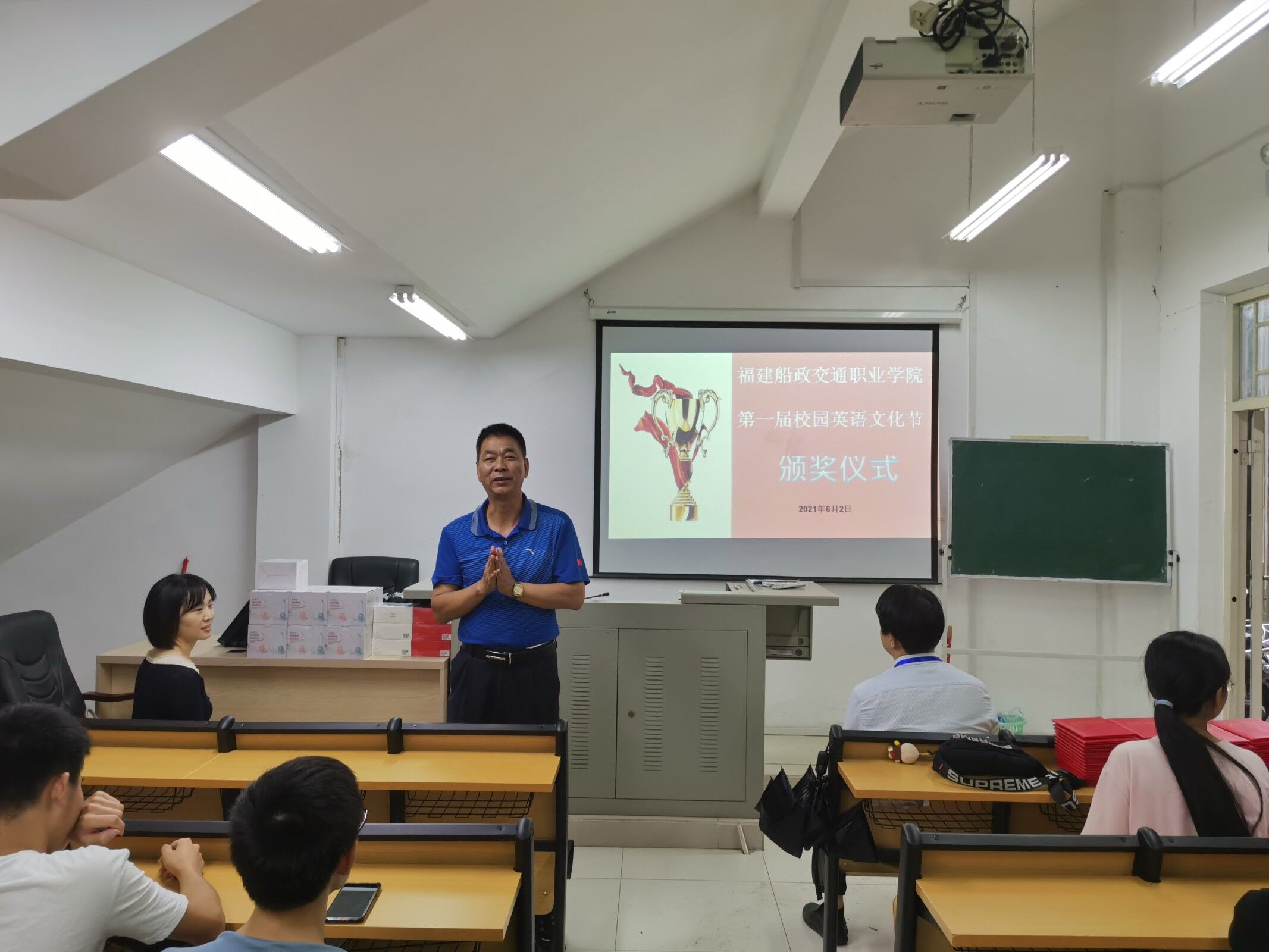2021年6月2日,通識教育學院在多媒體教室召開福建船政交通職業(yè)學院第一屆校園英語文化節(jié)頒獎儀式,通識教育學院方儒欽院長、金晶晶副院長和英語教研室吳菲菲主任出席此次頒獎儀式,并為獲獎選手們頒獎。