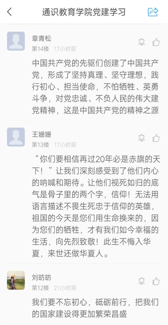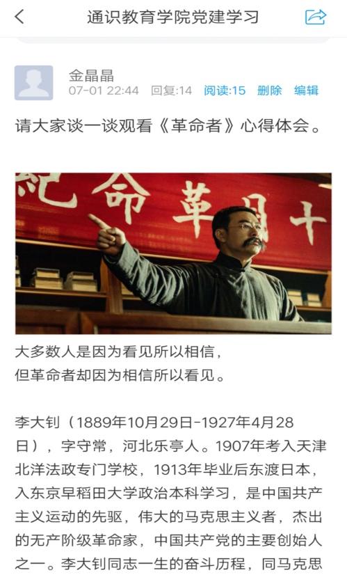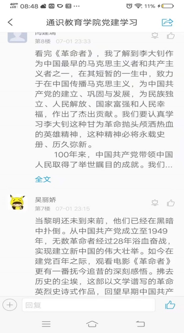 歷史川流不息,精神代代相傳。在觀影結(jié)束后各黨員通過“學(xué)習(xí)通”-“通識教育學(xué)院黨總支”-“討論”-“觀看黨建電影《革命者》,撰寫心得體會”,通過觀看紅色電影《革命者》,師生黨員深刻感受到中國共產(chǎn)黨先驅(qū)們偉大的建黨精神,在奮斗中堅持真理、堅守理想,踐行初心、擔(dān)當使命,不怕犧牲、英勇斗爭,對黨忠誠、不負人民,大家紛紛表示要繼續(xù)弘揚光榮傳統(tǒng)、賡續(xù)紅色血脈,永遠把偉大建黨精神繼承下去、發(fā)揚光大。