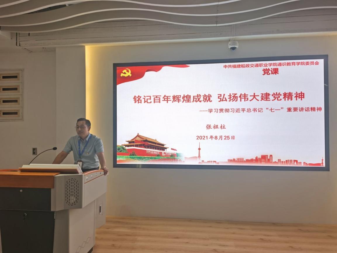 為深入學(xué)習(xí)貫徹習(xí)近平總書(shū)記在黨史學(xué)習(xí)教育動(dòng)員大會(huì)、習(xí)近平總書(shū)記在慶祝中國(guó)共產(chǎn)黨成立100周年大會(huì)上的重要講話(huà)和來(lái)閩考察時(shí)重要講話(huà)指示精神,扎實(shí)推進(jìn)黨史學(xué)習(xí)教育走深走實(shí),8月25日上午,學(xué)院黨委委員、副院長(zhǎng)張祖柱在學(xué)院黨建·思政·船政文化研學(xué)中心作題為《銘記百年輝煌成就,弘揚(yáng)偉大建黨精神》黨史學(xué)習(xí)教育專(zhuān)題黨課,通識(shí)教育學(xué)院黨總支全體黨員參加。