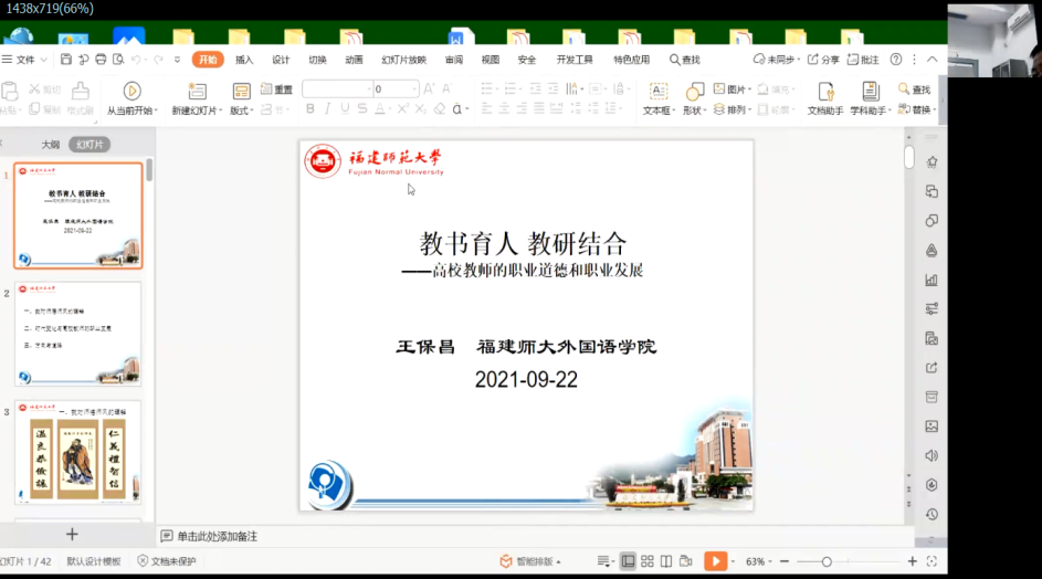 9月22日下午,福建師范大學外國語學院王保昌老師以“教書育人 教研結合——高校教師的職業(yè)道德和職業(yè)發(fā)展”為題開展師德師風專題培訓,分享對教師職業(yè)的理解,闡明高校教師師德師風建設的重要性,從時代變化分析高校教師職業(yè)發(fā)展中的機遇與挑戰(zhàn),提出發(fā)展方向、道路等工作建議,既要做到“學高為師,身正為范”,具備有高超的教育教學能力,更要有高尚的人格品質,爭做“四有”好老師、當好“四個引路人”、實現(xiàn)“四個相統(tǒng)一”。最后,王老師建議,高校教師要結合教學工作開展教學研究,以教學研究帶動教學工作,實現(xiàn)二者融合發(fā)展。