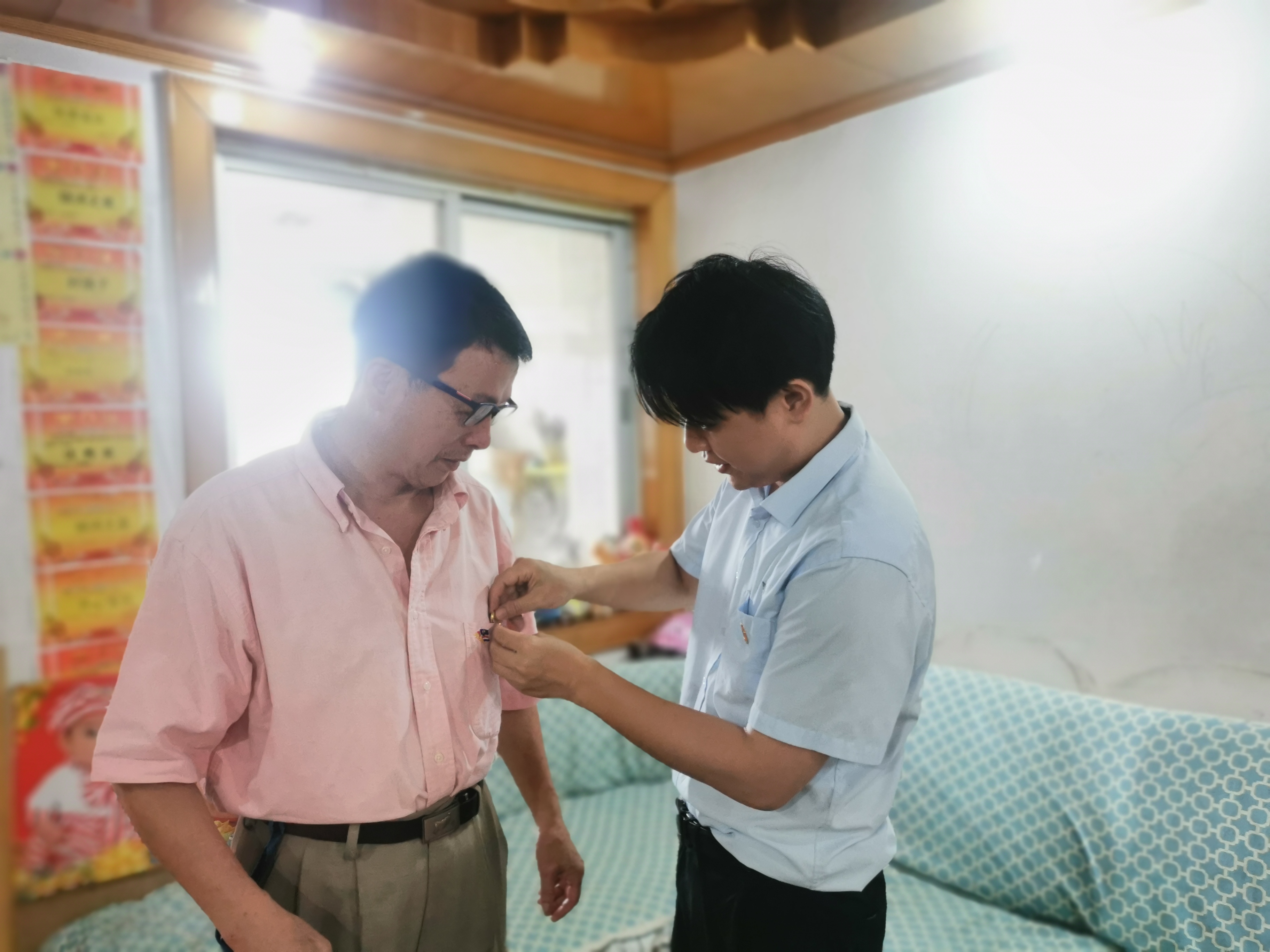 老黨員陳于東精神矍鑠、思維敏捷、積極傳播正能量。金晶晶和劉淋送上祝福和慰問品,祝陳于東老師健康長壽、闔家幸福,希望他始終保持優(yōu)良作風(fēng),不忘初心、牢記使命,繼續(xù)為黨奉獻力量,為學(xué)院發(fā)展作出貢獻。