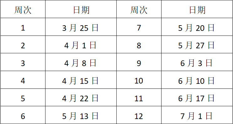 每班共上課12周,每周1次課,每次課90分鐘,共計12次課24學時。上課時間詳見教學計劃(如遇特殊情況,課程將會適當調(diào)整)。