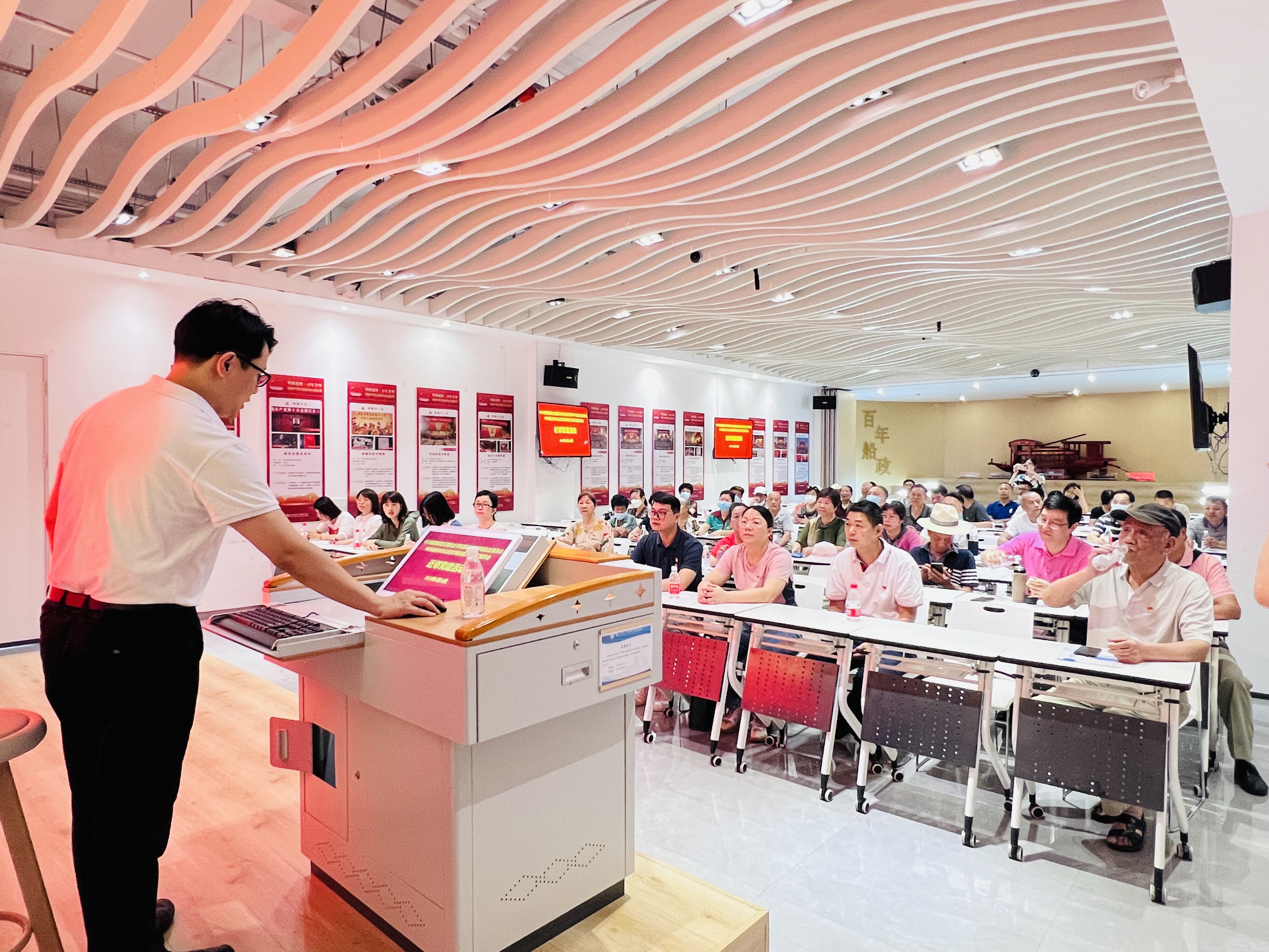 在活動(dòng)中,黨員調(diào)研參觀我校校史館、黨建思政文化暨船政文化研學(xué)中心,對(duì)船政先輩愛國(guó)自強(qiáng)、開拓進(jìn)取、勇于創(chuàng)新的英雄事跡和愛國(guó)精神表示崇高敬意,對(duì)我校黨建工作成效給予肯定和高度贊揚(yáng)?,F(xiàn)場(chǎng)氣氛熱烈,黨員們時(shí)而全神貫注聆聽講解,時(shí)而點(diǎn)頭肯定和贊嘆。