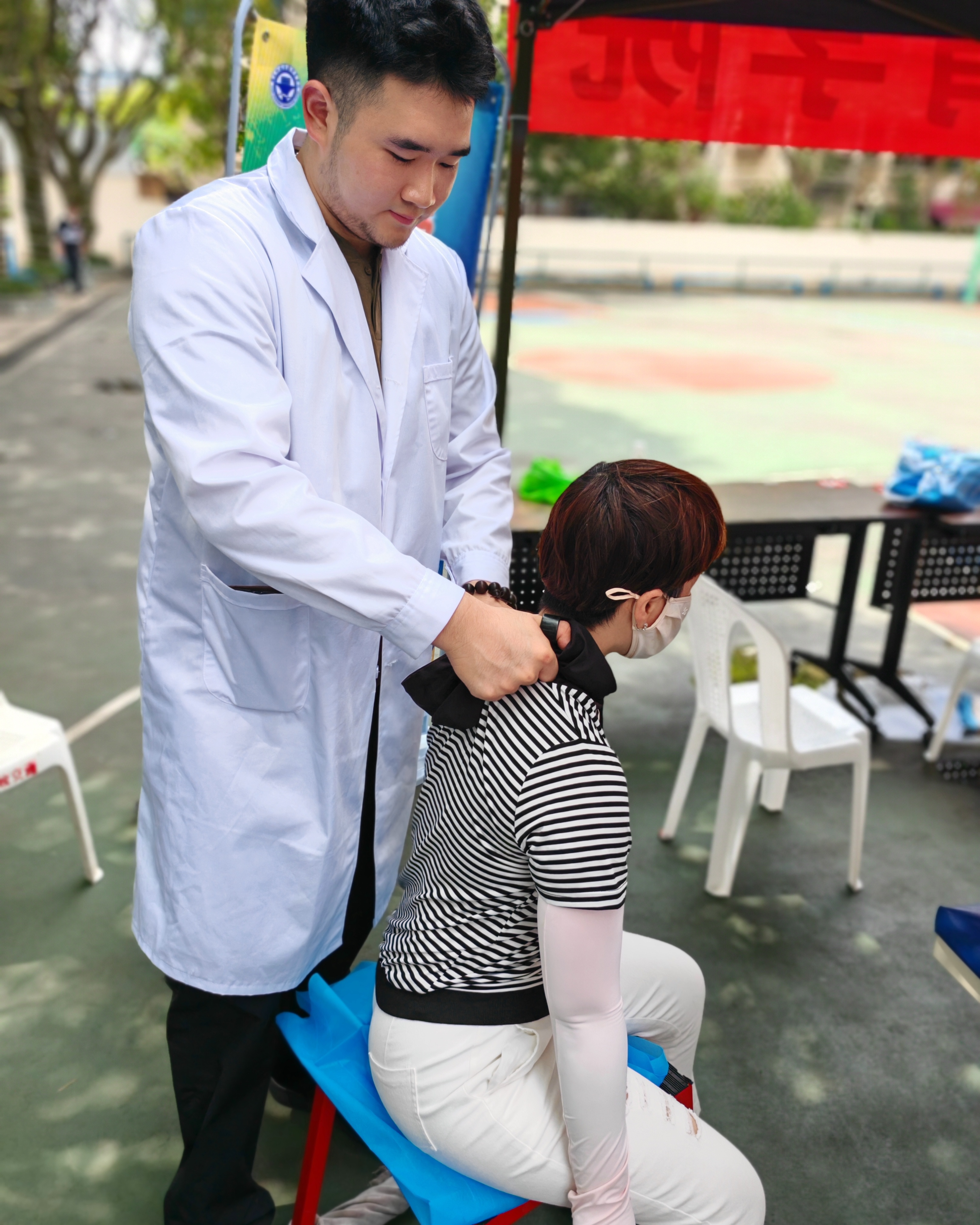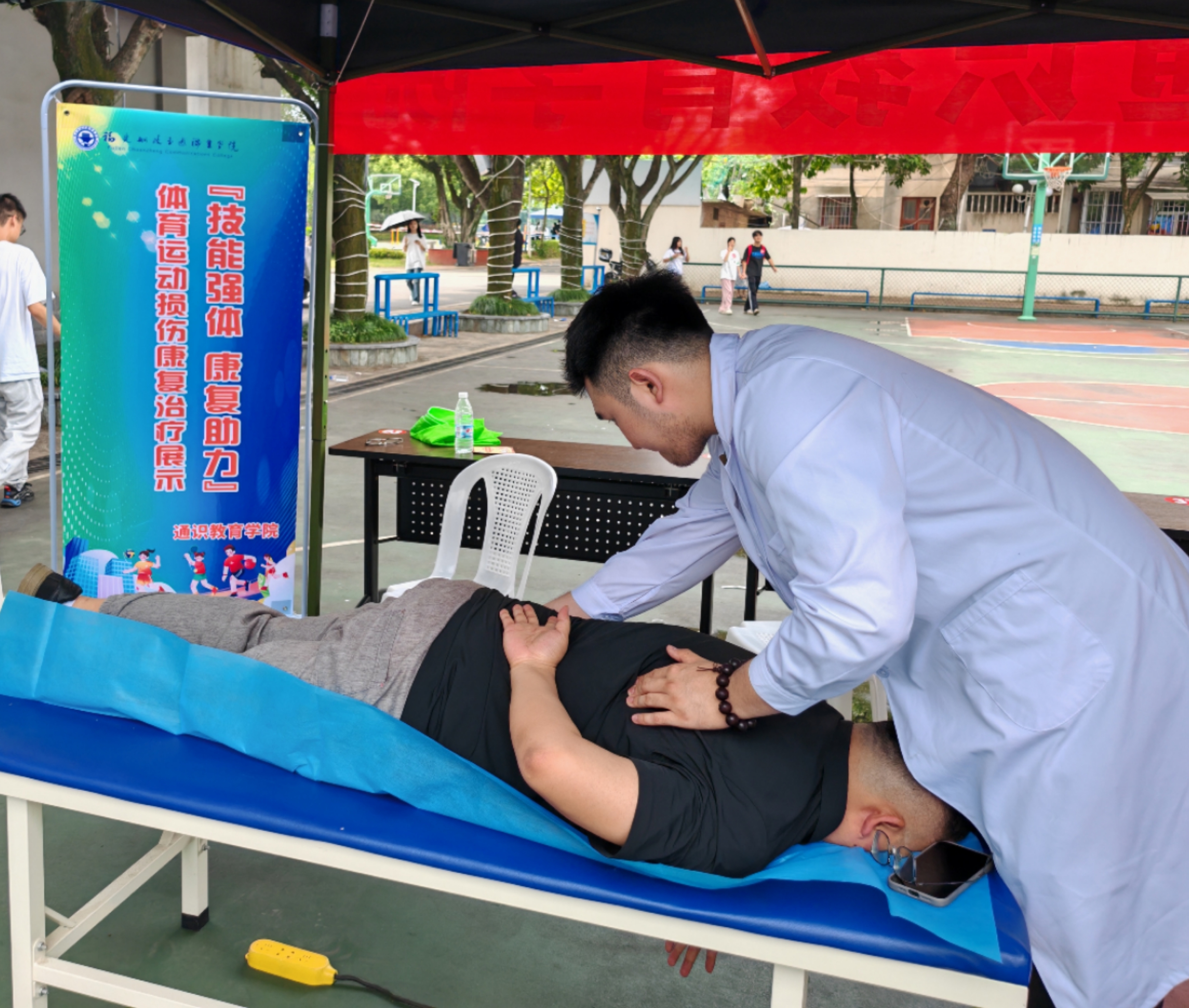 活動現(xiàn)場,學生團隊在教師指導下,為參觀者展示推拿、穴位按摩等中醫(yī)傳統(tǒng)康復技法,并重點針對運動中常見的腰椎間勞損問題,現(xiàn)場演示“評估-手法-養(yǎng)護”全流程解決方案。學生們結合人體經絡模型,細致講解腰部穴位定位及保健手法,同時向長期久坐、運動愛好者等群體提出“科學熱身+核心肌群訓練+日常姿勢管理”等針對性建議,受到廣泛好評。