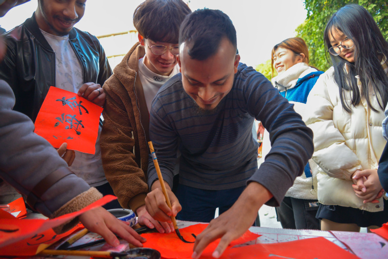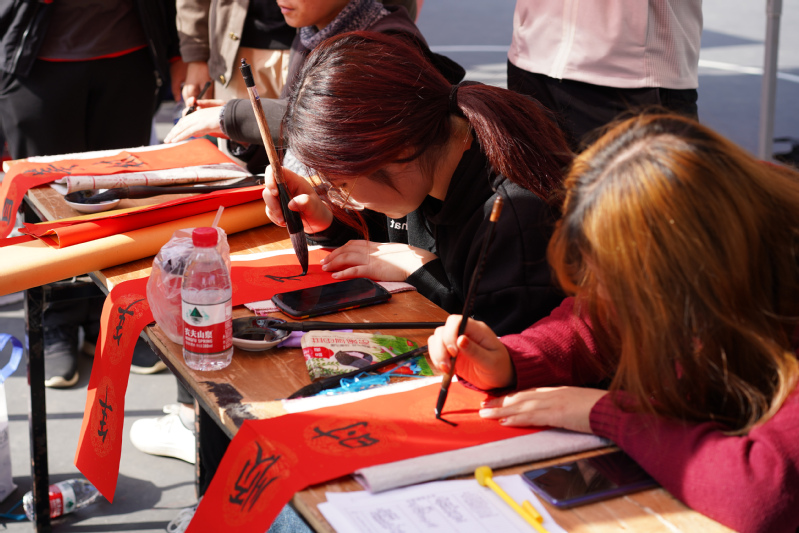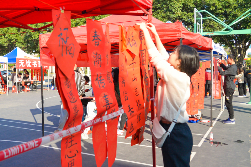 現(xiàn)場(chǎng)院團(tuán)委書法社團(tuán)和各系宣傳部的同學(xué)們揮毫潑墨,灑下新年祝福的話語(yǔ), 活動(dòng)現(xiàn)場(chǎng)還吸引了我院外國(guó)留學(xué)生一同為新年寫下祝福。一幅幅寓意祥瑞的春聯(lián),一個(gè)個(gè)飽含神韻的“福”字送到了教職工和同學(xué)們的手中,活動(dòng)現(xiàn)場(chǎng)已然是一片喜慶的紅色海洋。師生一邊欣賞書法技藝,一邊品評(píng)春聯(lián)寓意,都爭(zhēng)先迎“?!被丶?,喜悅之情溢于言表。整個(gè)活動(dòng)現(xiàn)場(chǎng)翰墨的清香與眾人的歡笑,讓濃濃的年味提前灑滿交院。