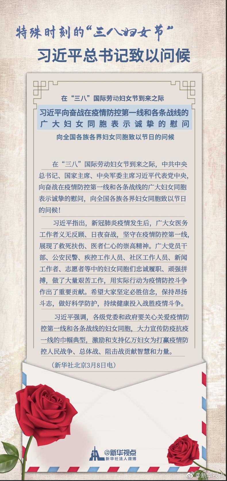 習(xí)近平強(qiáng)調(diào),各級黨委和政府要關(guān)心關(guān)愛疫情防控第一線和各條戰(zhàn)線的婦女同胞,大力宣傳防疫抗疫一線的巾幗典型,激勵和支持億萬婦女為打贏疫情防控人民戰(zhàn)爭、總體戰(zhàn)、阻擊戰(zhàn)貢獻(xiàn)智慧和力量。