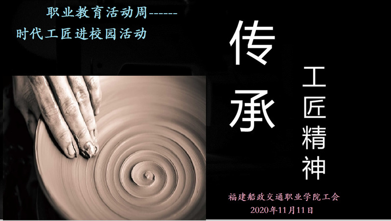 為進(jìn)一步營造全社會關(guān)心支持職業(yè)教育的良好氛圍,積極參與學(xué)院2020年職業(yè)教育活動(dòng)周,校工會于11月11日周三下午在教職工活動(dòng)中心開展“時(shí)代工匠進(jìn)校園”活動(dòng),特別邀請福建省非物質(zhì)遺產(chǎn)陶瓷藝術(shù)傳承人盧佳倫大師到校開展講座并親自帶領(lǐng)大家感受陶藝文化生活。