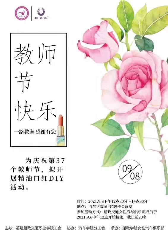 為慶祝第37個(gè)教師節(jié),福建船政交通職業(yè)學(xué)院工會(huì)主辦,汽車學(xué)院分工會(huì)協(xié)辦,船政學(xué)院女性汽車俱樂(lè)部承辦擬于9月8日下午12點(diǎn)30分工會(huì)在汽車學(xué)院(圖書(shū)館9樓)開(kāi)展精油口紅DIY活動(dòng)。名額僅限20名,歡迎大家踴躍報(bào)名。