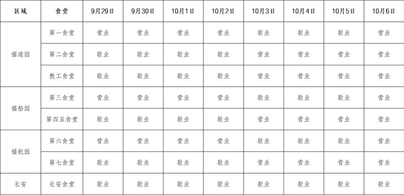 中秋國慶節(jié)假期各食堂開餐歇業(yè)表