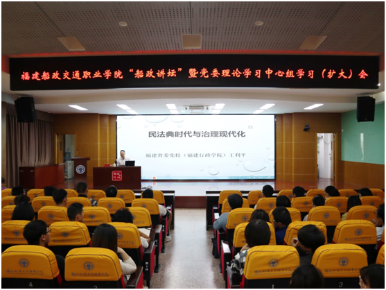 中國教育在線訊 10月15日,學(xué)院舉辦“船政講壇”暨黨委理論學(xué)習(xí)中心組學(xué)習(xí)(擴(kuò)大)會,特邀福建自貿(mào)試驗(yàn)區(qū)研究院執(zhí)行院長、省委黨校法學(xué)教研部副教授王利平作題為《民法典時代和治理現(xiàn)代化》專題輔導(dǎo)講座,黨委理論學(xué)習(xí)中心組成員、副科級以上干部、各黨總支、輔導(dǎo)員、馬克思主義學(xué)院全體教師,部分學(xué)生等200余人參加。