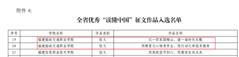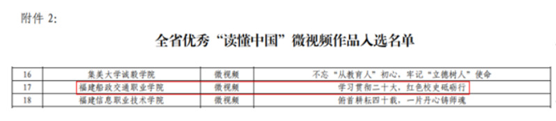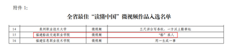 日前,福建省教育系統(tǒng)關(guān)工委公布了2023年我省高校參加“讀懂中國”活動入選作品名單,我院關(guān)工委榮獲全省優(yōu)秀組織獎,微視頻《“船”承人》成功入選全省最佳“讀懂中國”微視頻作品,《學(xué)習(xí)貫徹二十大,紅色校史砥礪行》榮獲全省優(yōu)秀“讀懂中國”微視頻作品,2篇學(xué)生征文入選全省優(yōu)秀征文作品。