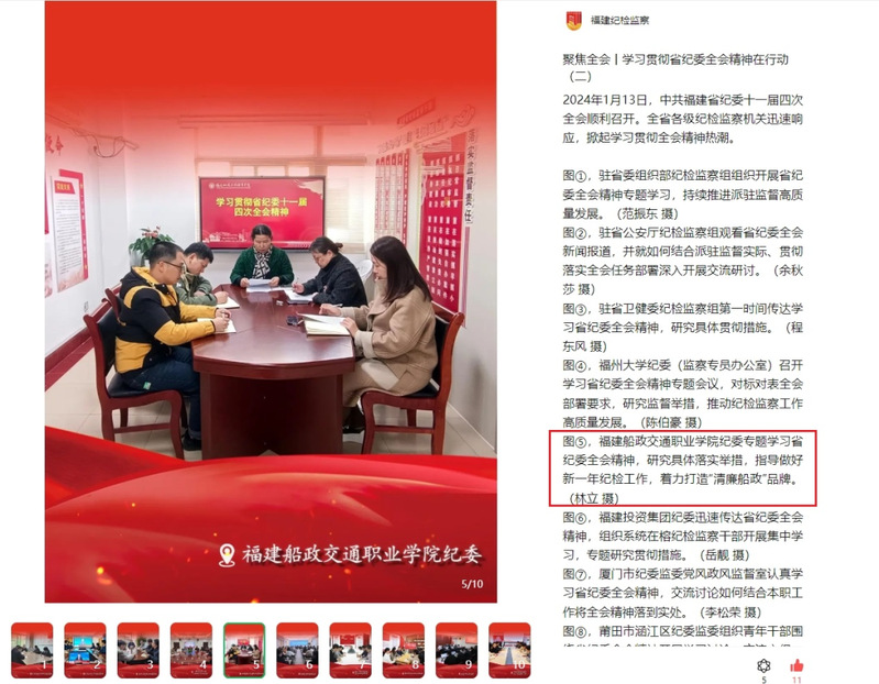 1月17日,福建省紀(jì)委監(jiān)委官網(wǎng)、福建紀(jì)檢監(jiān)察微信公眾號(hào)報(bào)道學(xué)院紀(jì)委專題學(xué)習(xí)省紀(jì)委十一屆四次全會(huì)精神,內(nèi)容如下:
