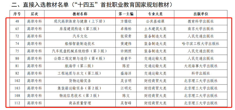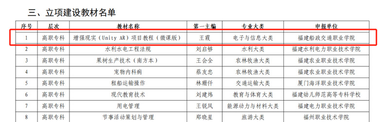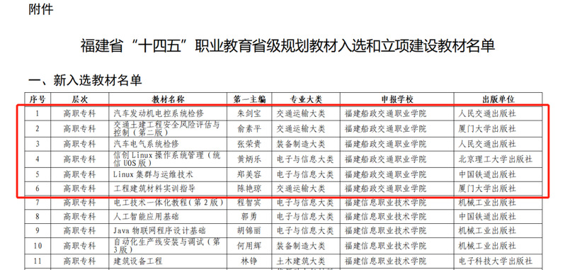近日,福建省教育廳公布“十四五”職業(yè)教育省級規(guī)劃教材入選和立項(xiàng)建設(shè)名單。經(jīng)過單位申報、形式審查、專家評審等嚴(yán)格程序,我院19本教材在眾多參評教材中脫穎而出(其中12本“十四五”首批職業(yè)教育國家規(guī)劃教材直接入選)。這是我院在貫徹落實(shí)黨中央、國務(wù)院對教材建設(shè)的決策部署和深化教育教學(xué)改革方面取得的重要成果。