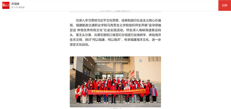 近日,新福建、高校思政網(wǎng)等主流媒體平臺報道我院開展“追尋領(lǐng)袖足跡 體悟優(yōu)秀傳統(tǒng)文化”社會實踐活動。