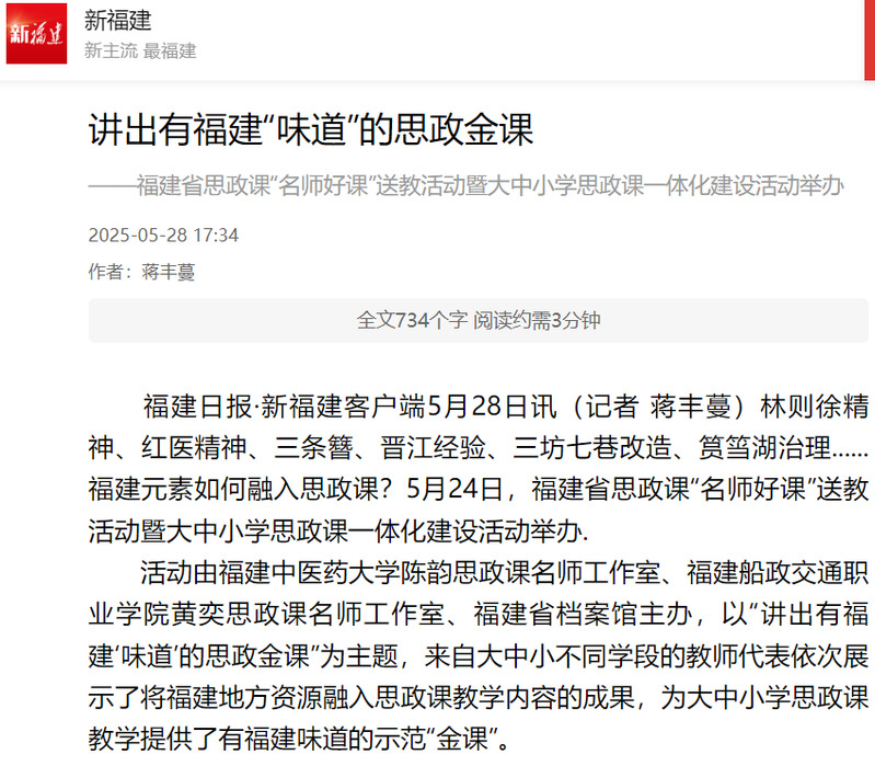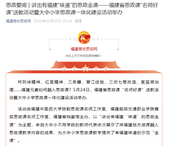 福建日報·新福建客戶端5月28日訊(記者 蔣豐蔓)林則徐精神、紅醫(yī)精神、三條簪、晉江經(jīng)驗、三坊七巷改造、筼筜湖治理......福建元素如何融入思政課?5月24日,福建省思政課“名師好課”送教活動暨大中小學(xué)思政課一體化建設(shè)活動舉辦。 活動由福建中醫(yī)藥大學(xué)陳韻思政課名師工作室、福建船政交通職業(yè)學(xué)院黃奕思政課名師工作室、福建省檔案館主辦,以“講出有福建‘味道’的思政金課”為主題,來自大中小不同學(xué)段的教師代表依次展示了將福建地方資源融入思政課教學(xué)內(nèi)容的成果,為大中小學(xué)思政課教學(xué)提供了有福建味道的示范“金課”。