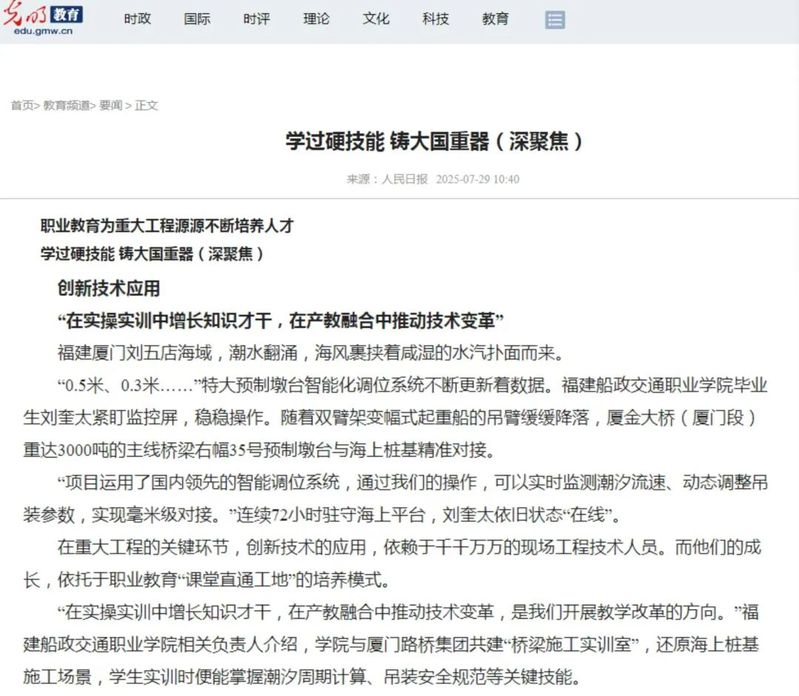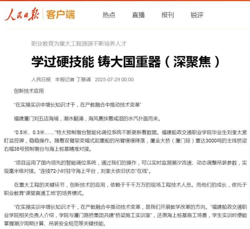 7月29日,人民網(wǎng)、新華網(wǎng)、光明網(wǎng)、中國網(wǎng)等中央主流媒體報(bào)道我院畢業(yè)生劉奎太參與廈金大橋(廈門段)建設(shè),展現(xiàn)學(xué)院在產(chǎn)教融合育人方面所取得的顯著成效。具體報(bào)道情況如下: