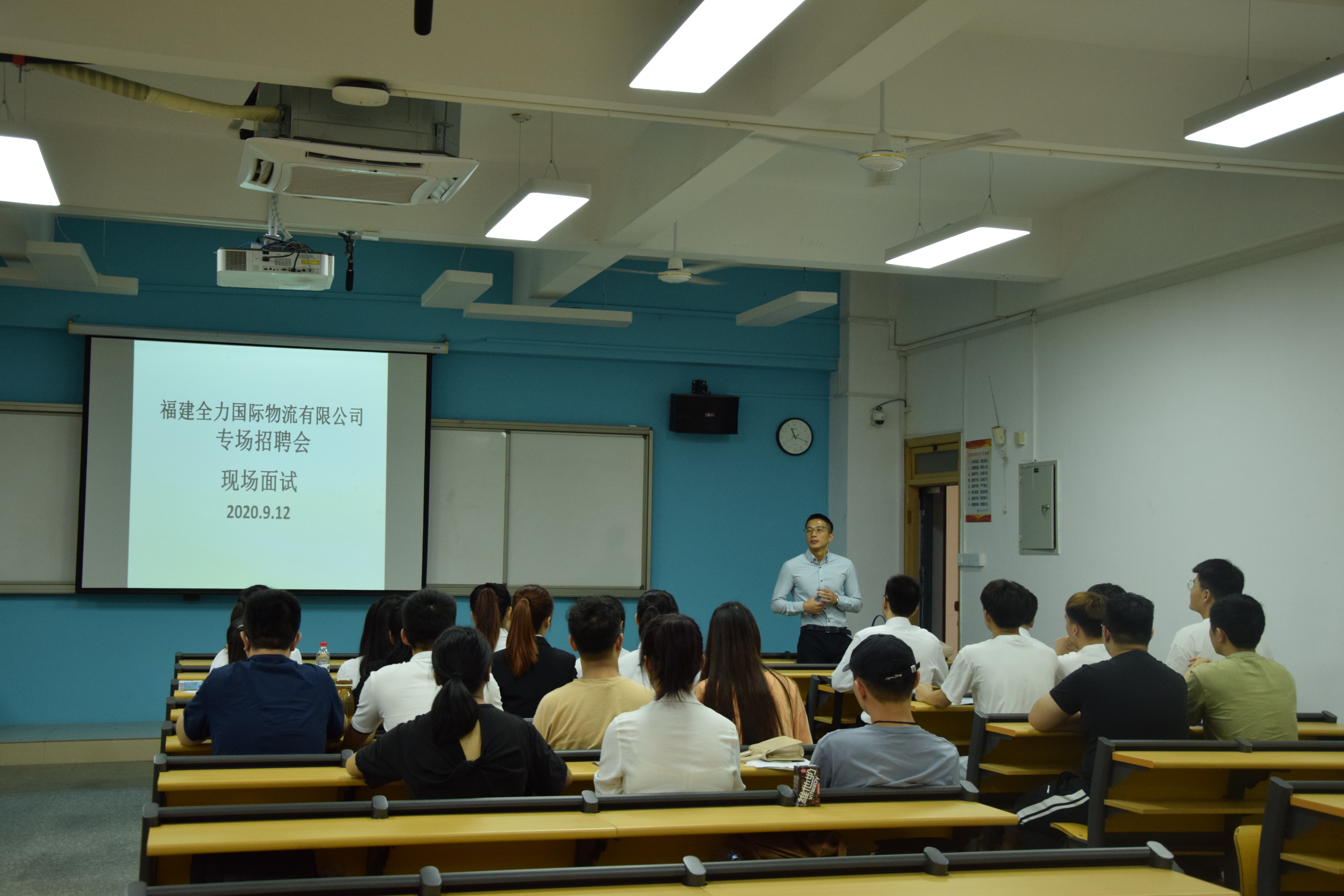 2020年9月12日上午,福建全力國際物流有限公司舉辦秋季校園專場宣講會在我院31號樓408教室順利召開。本次校園招聘會由福建全力國際物流有限公司福州分公司總經(jīng)理陳偉明向我院2021屆物流管理和報關(guān)與國際貨運畢業(yè)生進行宣講,共有近200名畢業(yè)生參與本次宣講會。