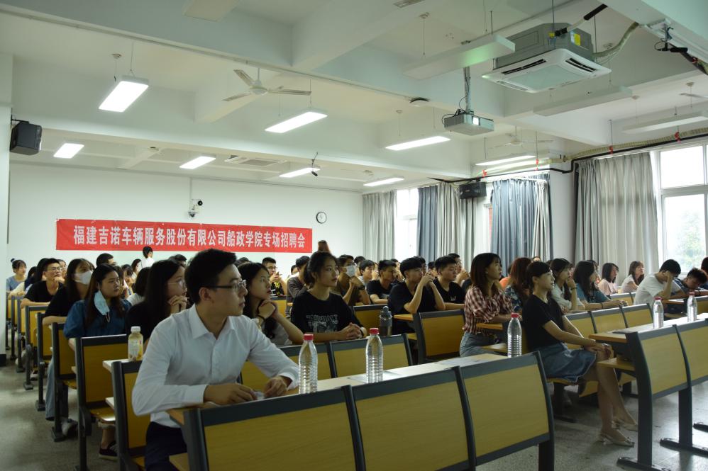 為切實做好應(yīng)屆畢業(yè)生就業(yè)工作的穩(wěn)步推進,拓寬校企合作渠道,2020年9月12日上午經(jīng)濟與管理學(xué)院與福建吉諾車輛服務(wù)股份有限公司在福建船政交通職業(yè)學(xué)院31號樓308教室共同舉辦秋季校園專場宣講會。經(jīng)濟與管理學(xué)院院長房曰榮、經(jīng)濟與管理學(xué)院副院長林穎、吉諾公司客服部總監(jiān)劉偉彪、吉諾股份董事會秘書賴道菊,以及2021屆市場營銷專業(yè)和電子商務(wù)專業(yè)100余名畢業(yè)生共同出席本次宣講會。