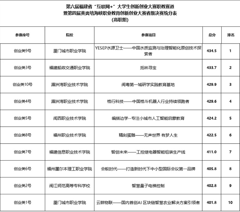 高職組創(chuàng)業(yè)組決賽統(tǒng)分表及排名如下:
