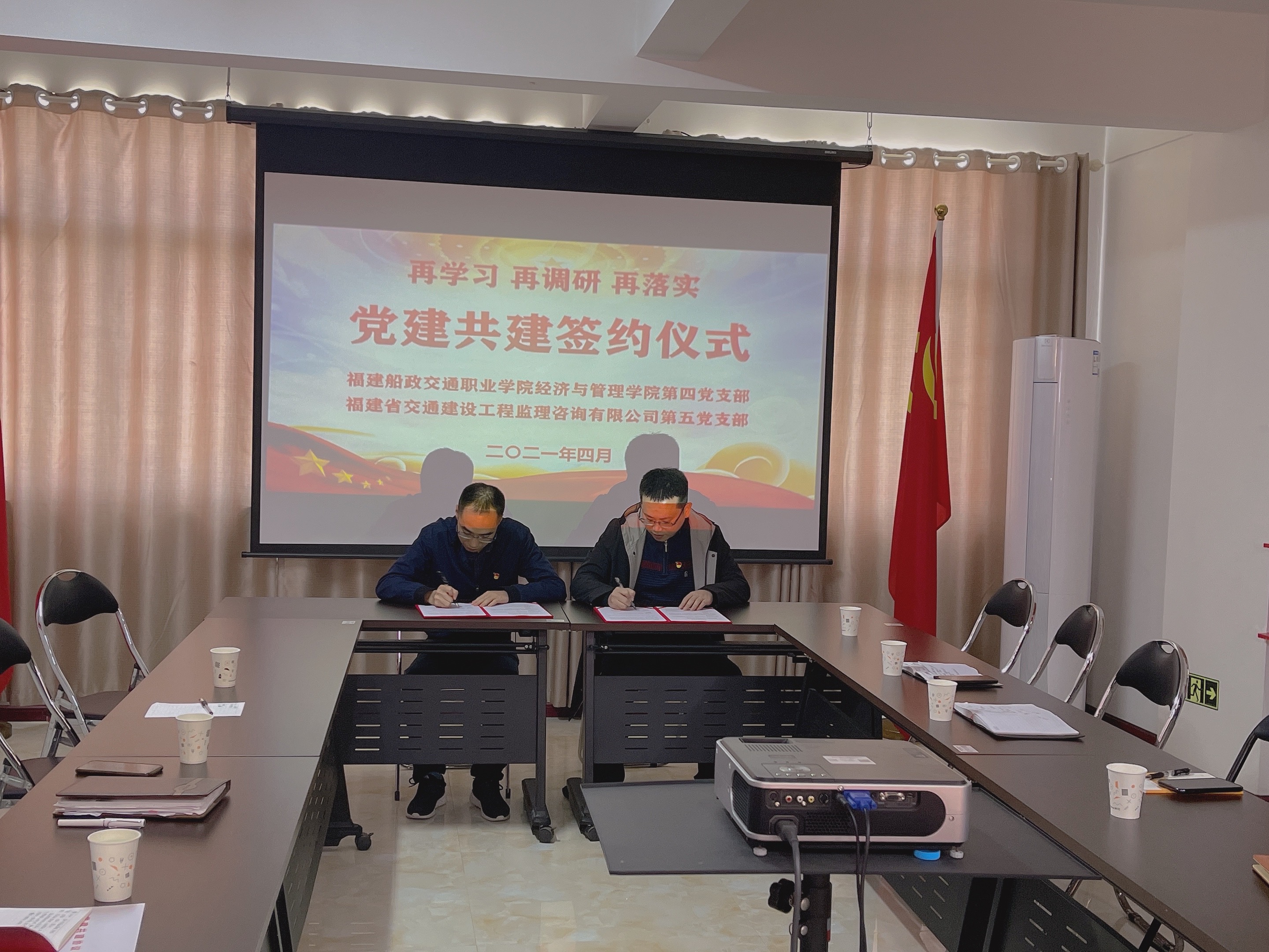 為深入學習貫徹黨的十九大和十九屆五中全會精神,推動落實《交通強國建設綱要》,全面推進支部建設,搭建黨建共建平臺,形成基層黨建工作新格局,2021年4月16日,經濟與管理學院黨總支書記俞素平帶領第四黨支部書記伍雄斌、副書記謝霓等相關人員赴平潭拜訪了福建省交通建設工程監(jiān)理咨詢有限公司平潭分公司,與福建省交通建設工程監(jiān)理咨詢有限公司副總經理李少凡、紀委書記陳銘、第五黨支部書記林凌等有關人員座談,并簽署了經濟與管理學院第四支黨支部與福建省交通建設工程監(jiān)理咨詢有限公司第五黨支部共建協(xié)議書。