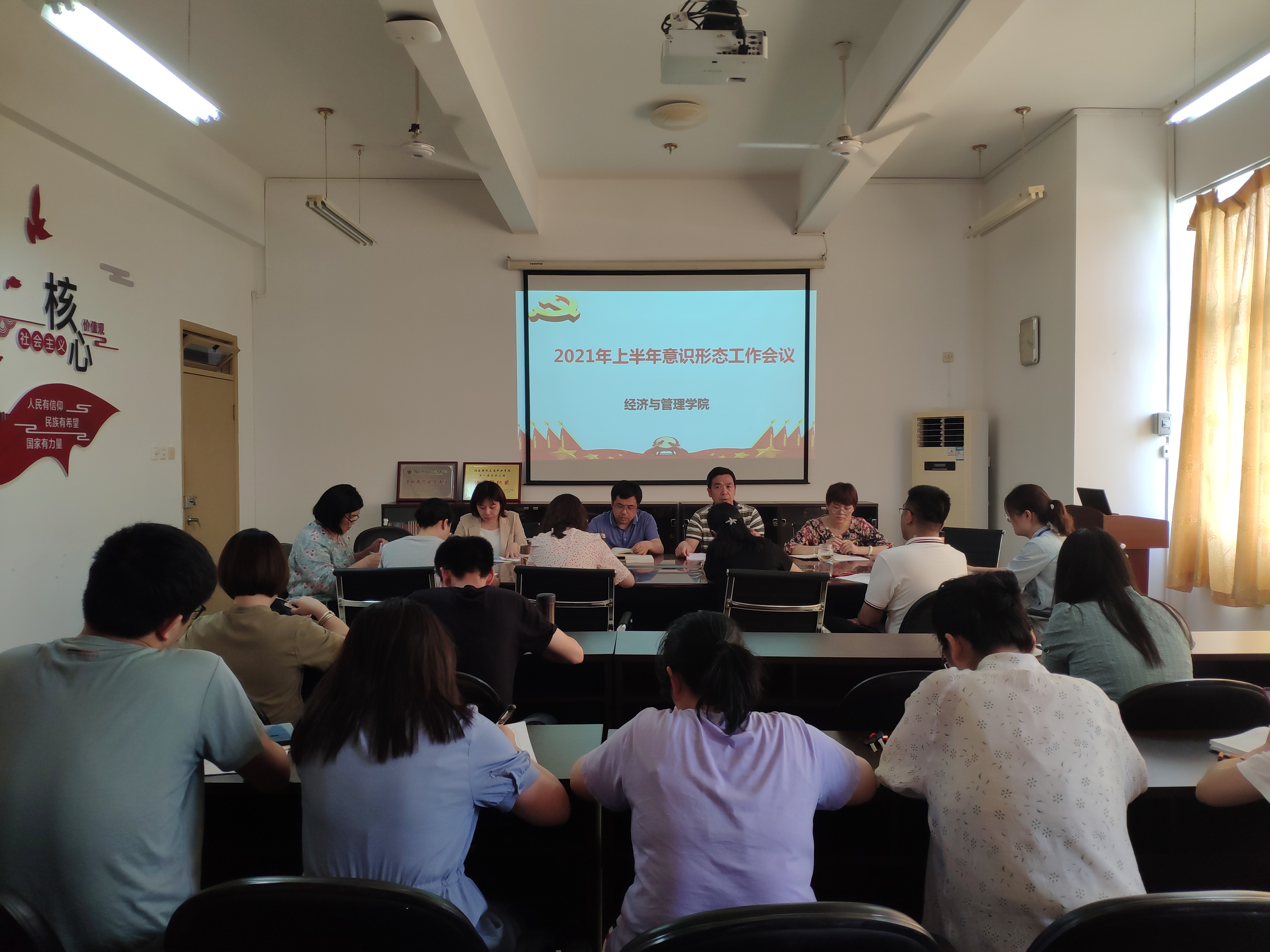 為進一步深化意識形態(tài)工作認識,推動意識形態(tài)工作深層次開展,切實加強意識形態(tài)對學院各項工作的引領,6月16日,經濟與管理學院召開2021年上半年意識形態(tài)工作會議,總結全院意識形態(tài)工作,對下階段意識形態(tài)工作進行研判。院領導、辦公室主任、分團委書記、教研室主任、輔導員、黨支部書記(副書記)參加會議。會議由院黨總支書記俞素平同志主持。