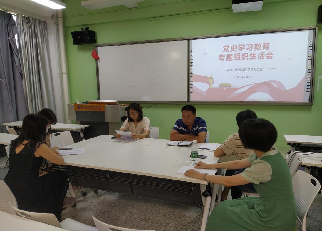 為激勵(lì)支部全體黨員從黨的歷史中汲取砥礪奮進(jìn)的精神力量,進(jìn)一步強(qiáng)化黨史學(xué)習(xí)教育成效,根據(jù)《中共福建省委辦公廳關(guān)于認(rèn)真學(xué)習(xí)貫徹習(xí)近平總書記在慶祝中國(guó)共產(chǎn)黨成立100周年大會(huì)上的重要講話的通知》、《福建省教育系統(tǒng)黨史學(xué)習(xí)教育領(lǐng)導(dǎo)小組辦公室轉(zhuǎn)發(fā)中共福建省委黨史學(xué)習(xí)教育領(lǐng)導(dǎo)小組辦公室關(guān)于召開黨史學(xué)習(xí)教育專題組織生活會(huì)的通知》等文件精神,2021年8月8日,經(jīng)濟(jì)與管理學(xué)院第三黨支部召開支部黨史學(xué)習(xí)教育專題組織生活會(huì),支部全體黨員參加了會(huì)議。