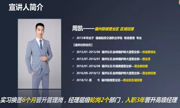 隨后第二個(gè)環(huán)節(jié),德邦福州大區(qū)負(fù)責(zé)人唐文建先生向畢業(yè)生發(fā)出誠摯的邀請(qǐng)。德邦的發(fā)展歷程、企業(yè)文化,以及公司培養(yǎng)新人的方式,得到眾多參會(huì)畢業(yè)生的認(rèn)同。