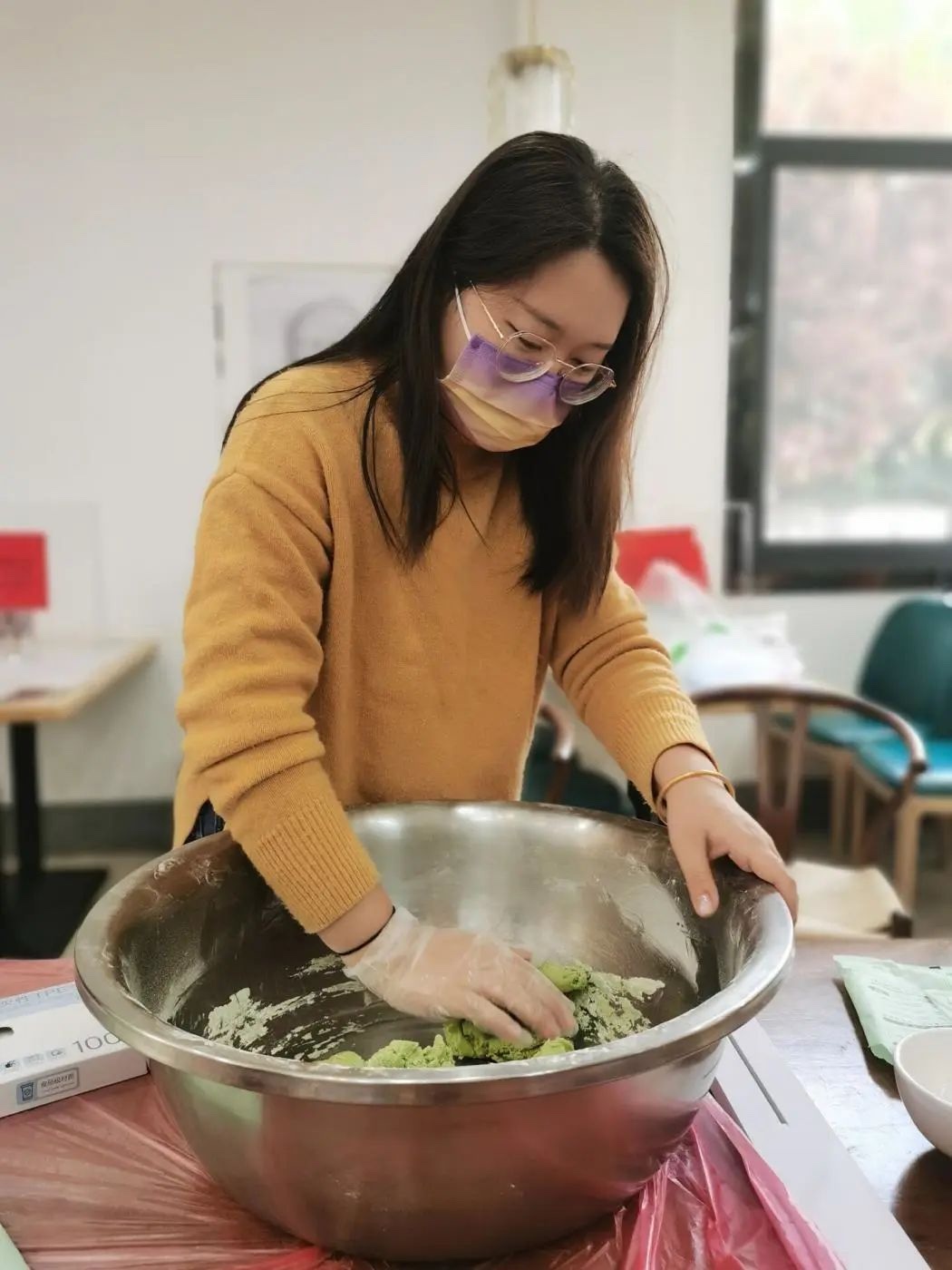 前幾天天下著雨,陰沉沉的,學(xué)生的思鄉(xiāng)情緒倍增?!袄蠋?,清明節(jié)可以請(qǐng)假回家嗎?”學(xué)生的話語(yǔ)牽動(dòng)著我的心,是啊,每逢佳節(jié)倍思親,因?yàn)橐咔樵颍瑢W(xué)生暫時(shí)沒(méi)能夠回家。為了緩解同學(xué)們?cè)谛5乃监l(xiāng)之情,我們能為學(xué)生做些什么?;叵肫鹜瑢W(xué)說(shuō)過(guò),清明節(jié)的時(shí)候回家總可以吃到青團(tuán),今年回不了家就吃不到了?!皩?duì)呀,我們可以給學(xué)生做青團(tuán),也可以讓學(xué)生參與進(jìn)來(lái)一起做!”找材料,找位置,買材料,最后敲定在食堂一樓做青團(tuán)。我們做青團(tuán)的活動(dòng)就這么展開(kāi)了,買材料,找材料,開(kāi)始和青團(tuán)的面團(tuán),和好的面團(tuán)后,一步一步教學(xué)生包青團(tuán),做完青團(tuán)大家都非常期待等待著自己特色的青團(tuán)出爐,吃到自己親手做的青團(tuán),還帶回去給同學(xué)吃??粗瑢W(xué)們吃得津津有味,臉上又露出了開(kāi)心的笑臉,看著他們這么開(kāi)心,我的心情也跟著開(kāi)心起來(lái)了。