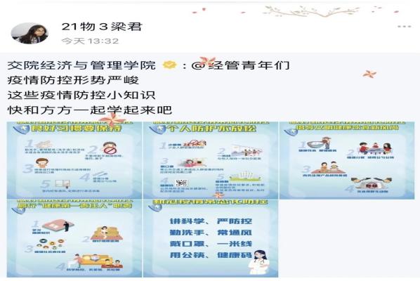 線上、線下進行防疫宣傳。突擊隊隊員們深入學生宿舍,與寢同學們親切地交談,叮囑他們在校內(nèi)要做好疫情防護工作,并積極配合學校和學院的防疫工作,為疫情防控工作貢獻自己的一份力量。同時隊員們還利用QQ、微信等平臺傳播疫情防護小知識引導同學們科學理性看待疫情。