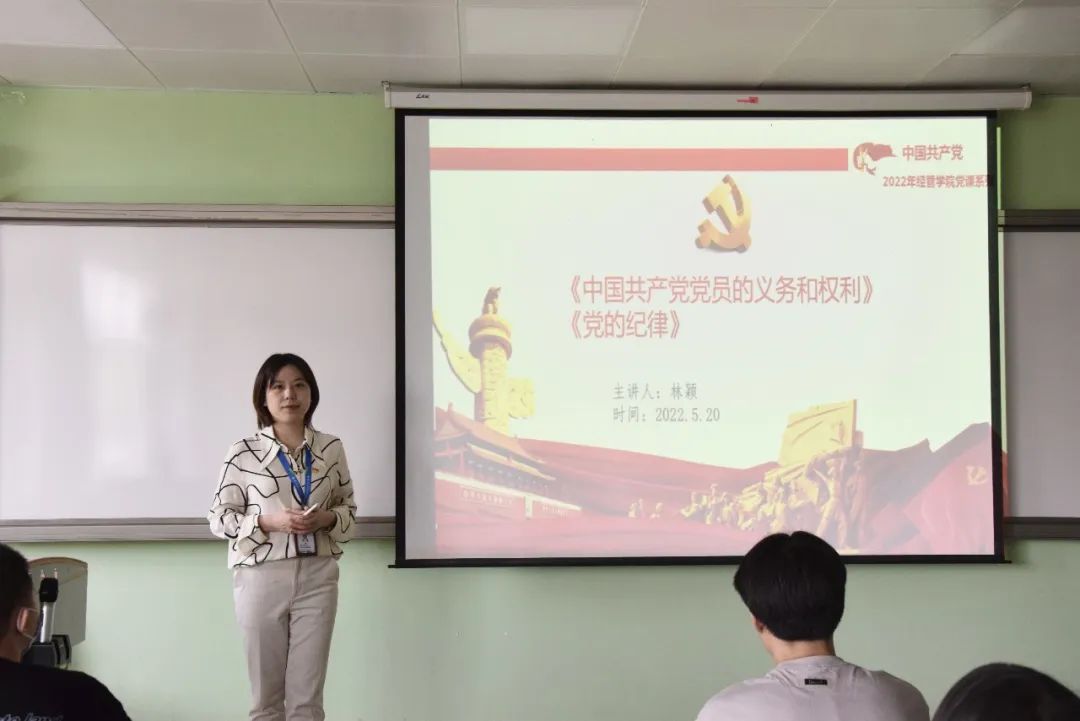 經(jīng)濟(jì)與管理學(xué)院副院長林穎從“中國共產(chǎn)黨黨員的義務(wù)和權(quán)利”、黨的紀(jì)律兩方面講解,林穎院長強(qiáng)調(diào)作為當(dāng)代大學(xué)生應(yīng)始終踐行肯吃苦樂奉獻(xiàn)的精神,要做到在思想上始終保持一份清醒,在行動上始終恪守一份理智,以平和之心對待名,以淡泊之心對待位,以知足之心對待利,以公正之心對待權(quán),以進(jìn)取之心對待事。
