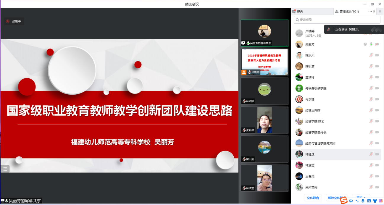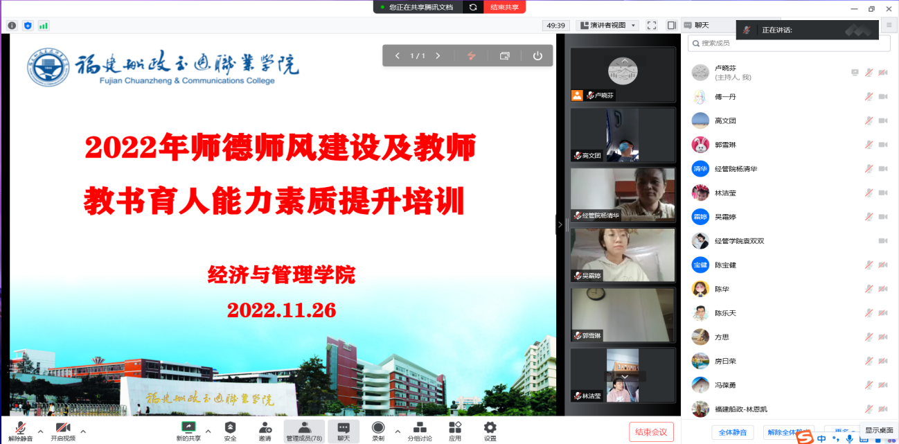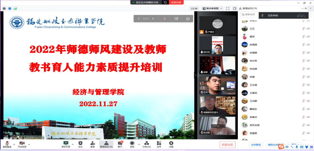 為加強(qiáng)我院教師隊伍建設(shè),促進(jìn)教師專業(yè)成長,綜合提升我院教師師德修養(yǎng)和能力水平,11月26至27日,我院舉辦2022年師德師風(fēng)建設(shè)及教師教書育人能力素質(zhì)提升培訓(xùn)。邀請了兩位專家教授進(jìn)行授課,吳麗芳教授,福建幼兒師范高等??茖W(xué)校學(xué)前教育學(xué)院院長、首批國家級教學(xué)創(chuàng)新團(tuán)隊立項建設(shè)單位負(fù)責(zé)人、教育部職業(yè)院校教育類專業(yè)教學(xué)指導(dǎo)委員會委員,福建省杰出人民教師;熊毅教授,泉州經(jīng)貿(mào)學(xué)院教務(wù)處處長、福建省名師、福建省教師教學(xué)創(chuàng)新團(tuán)隊負(fù)責(zé)人。經(jīng)管學(xué)院全體專任教師、實(shí)驗(yàn)員、輔導(dǎo)員及其他學(xué)院老師參加本次培訓(xùn)。因疫情原因,本次培訓(xùn)通過線上形式進(jìn)行,培訓(xùn)由房曰榮院長主持。