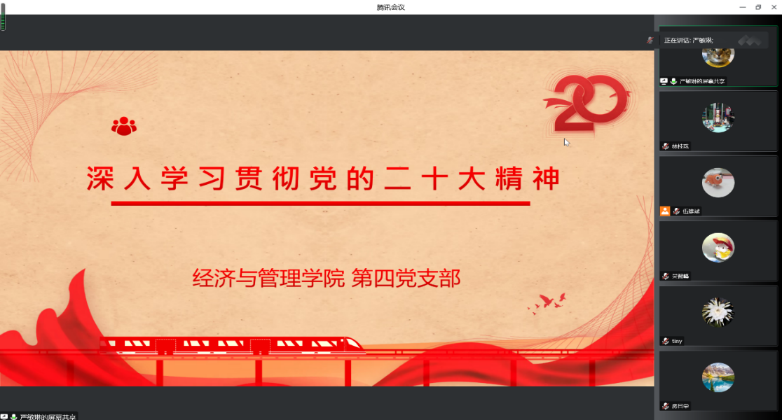 2022年11月25日,由于疫情的影響,經(jīng)濟與管理學(xué)院第四黨支部以“深入學(xué)習(xí)貫徹黨的二十大精神”為主題,在線上組織學(xué)習(xí)黨的二十大報告。會議由支部書記嚴(yán)敏琳同志主持,支部全體黨員參加了此次學(xué)習(xí)。
